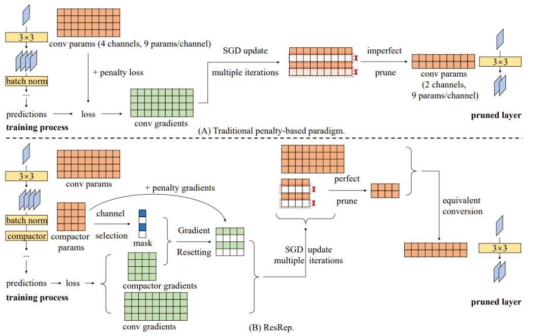 1. 解耦学习和遗忘机制的神经网络压缩方法 2021年10月,清华大学脑与认知科学研究院丁贵广团队在计算机视觉领域国际顶级会议 ICCV发表了一篇题为“ResRep: Lossless CNN Pruning via Decoupling Remembering and Forgetting”的文章,提出了一种简单高效、性能优越的神经网络压缩(剪枝)方法,显著超越现有其他方法。 神经科学研究表明,动物脑中的记忆和遗忘是两个相对独立的过程,由不同的化学物质和机制控制。现有的模型剪枝方法往往通过在训练过程中加入特殊的正则项来实现剪枝,在这一过程中“记忆”(保持精度不降低)和“遗忘”(剪掉某些结构)是耦合的,因而效果不佳。本文提出在剪枝过程中解耦“记忆”和“遗忘”,额外构造特殊结构来承载剪枝造成的负面影响,取得了显著超过其他方法的压缩效果。在常用的标准ResNet-50模型上,这一方法可以在超过50%压缩率的前提下实现精度完全不降低。 2. 深度极简卷积神经网络通用模型与结构重参数化 2021年6月,清华大学脑与认知科学研究院丁贵广团队在计算机视觉领域国际顶级会议 CVPR发表了一篇题为“RepVGG: Making VGG-Style ConvNets Great Again”的文章,提出了一种极简、高效、对定制人工智能芯片非常友好的卷积网络通用模型(RepVGG)。 现有实用卷积神经网络架构(如ResNet、RegNet)多为多分支架构,结构复杂,并行度低,速度慢,内存利用率低。虽然经典的单路架构(如VGG-16)具有结构简单、并行度高、速度快、内存利用率高的特点,但是性能(精度)显著低于多分支架构,所以不实用。本文提出一种推理时单路径的卷积神经网络(称为RepVGG)和一种“结构重参数化”方法。这一方法可以将训练时的多分支架构与推理时的单路架构解耦:训练时的模型有多条分支,但在训练完成后将其通过结构重参数化方法等价转换为单分支的推理时模型。这一方法使得单路架构卷积神经网络性能比多分支网络更好或相当,又同时具有推理时结构简单、并行度高、速度快、内存利用率高的特点。 (原文链接//it.sohu.com/a/525206879_121119002)