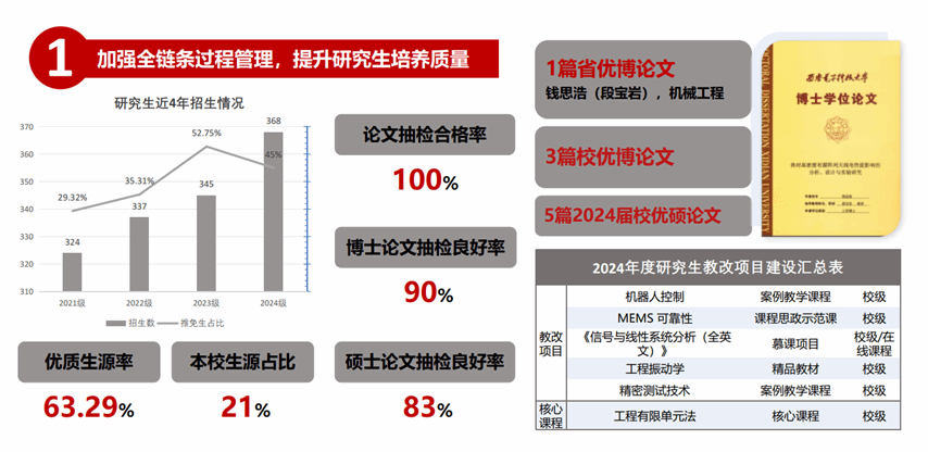 加强研究生全链条过程管理,提升研究生培养质量。构建多维度、多层次的生源质量提升策略,推免生接收数、优质生源数实现持续增长。深度参与卓越工程师教育的高质量发展,形成“五位一体”的育人新范式,新增“北方华创-西电复杂控制联合培养基地”等校院级联合培养基地2个。1篇博士生学位论文入选“陕西省优秀博士学位论文”;获批3篇校优博论文,5篇2024届校优硕论文。拓展优化学位点布局,增强做爱自拍