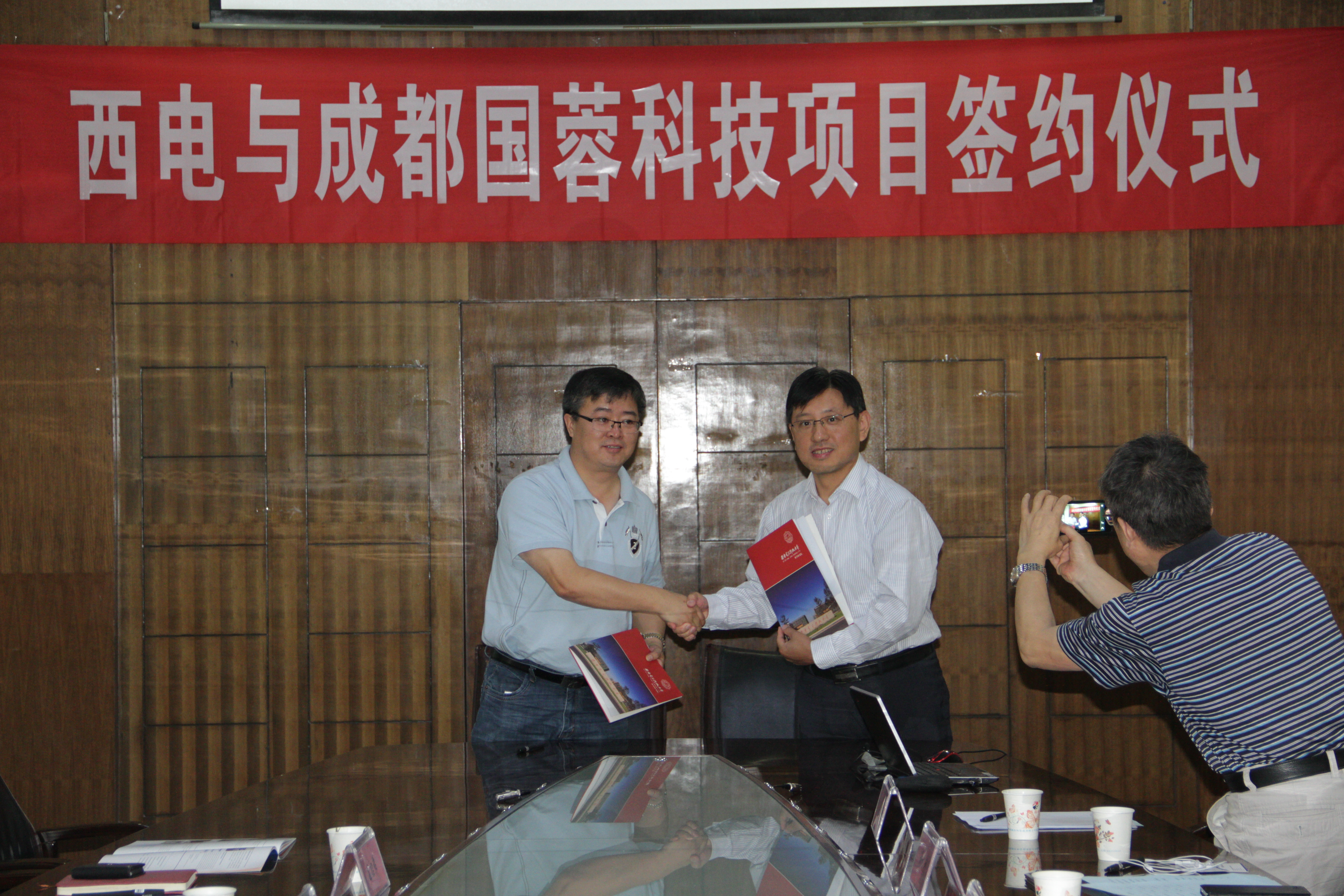 最后,双方还就人才招聘等方面交流了供需意见。黄进副院长代表机电院,张栋副总经理代表成都国蓉科技签署了“太阳能优化器的研制”项目合作协议。