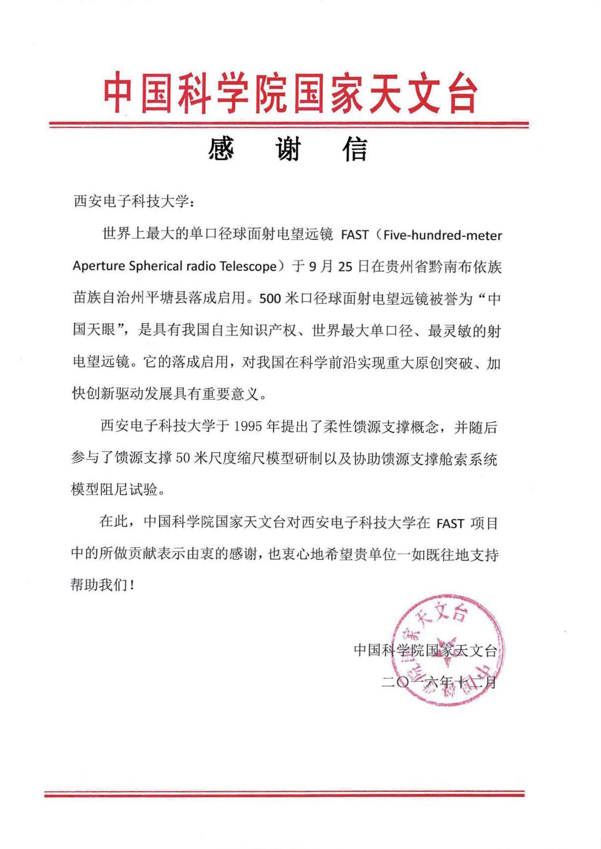 感谢信对段院士团队提出的柔性支撑馈源结构创新性设计表示了赞扬,肯定了做爱自拍