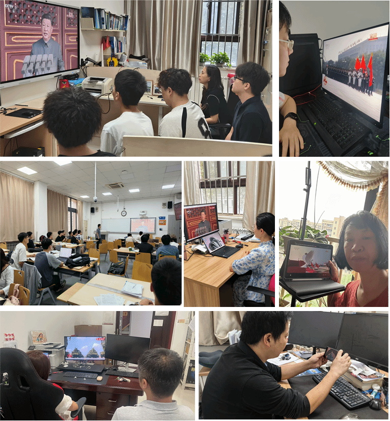 机电耦合实验室硕士第一党支部以党小组为单位,通过电视、网络、手机等多种形式收听。党支部书记王桂琛表示,观看阅兵式,让我们共同缅怀历史和先烈,再次被中华儿女血与火的雄壮史诗感染;同时,各种制式武器装备亮相,让我们也逐渐激动自豪起来,也时刻提醒着我们青年人要担负起科技创新强国的时代重任。