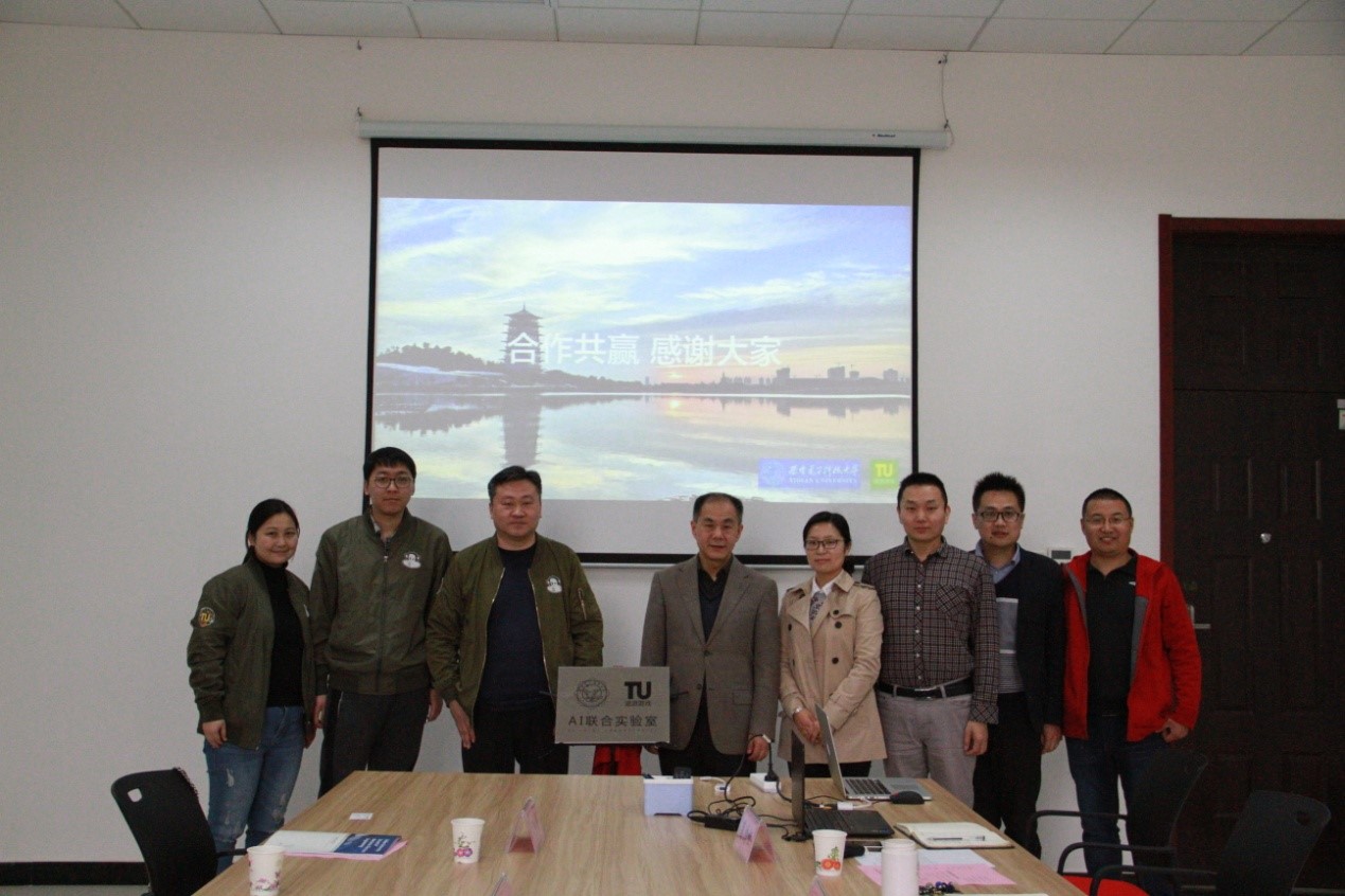 与在线途游(北京)科技有限公司共建“西电—途游 AI联合实验室”揭牌仪式在北校区主楼三区第二会议室成功举行。在线途游(北京)科技有限公司创始人兼CTO周欣、人力资源总监方媛媛、BI系统技术总监安晓宇、人力资源部王婷婷,做爱自拍
