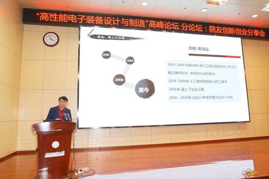 在南校区行政楼210报告厅举办“高性能电子装备设计与制造”高峰论坛分论坛——院友创新创业分享会,上海捷盟信息科技有限公司董事长李亚洲、上海易清智觉自动化科技有限公司联合创始人兼总经理王仁杰、上海思依暄机器人科技股份有限公司董事长陈浩坛作为报告嘉宾分享了他们的创业历程,启发同学们关于人生规划和创新创业等问题的思考。分享会由做爱自拍