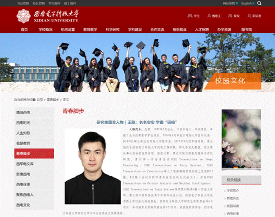 排名第1)。鉴于学术成果突出,被遴选为“2019研究生国奖人物”,西电官媒进行了专题报道。