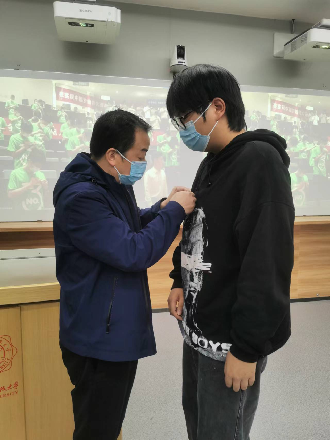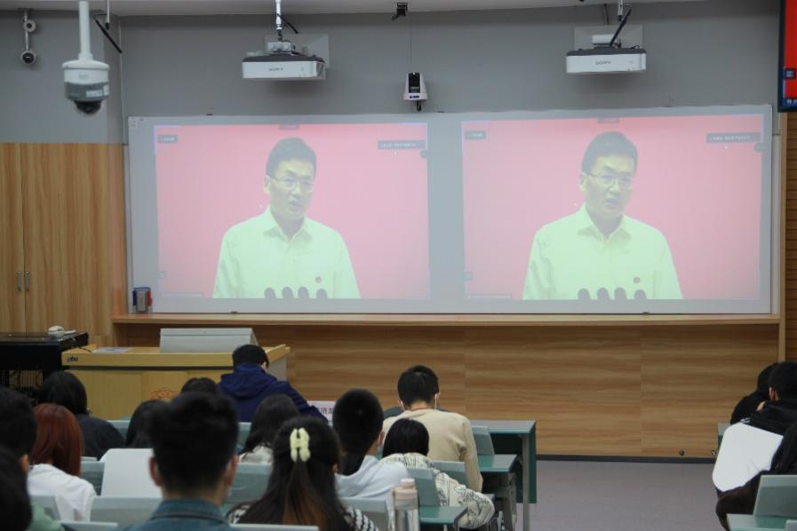 领导和全体研究生新生一起,全程观看了开学典礼的直播,并为2022级新生代表佩戴了校徽。