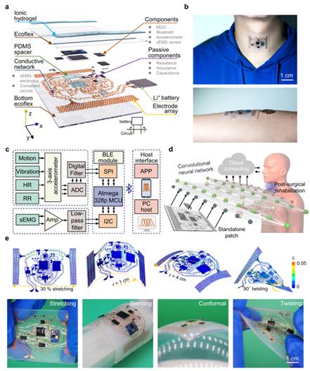 王卫东教授、厦门大学高立波副教授、香港大学陆洋教授以及宾州州立大学程寰宇教授联合唐都医院耳鼻喉科主任赵大庆教授和空军军医大学张杨教授等多位合作者,报道了一种用于喉部康复监测的具有传感器内自适应机器学习能力的全集成独立可延展的器件平台。成果以“A fully integrated, standalone stretchable device platform with in-sensor adaptive machine learning for rehabilitation”为题在《自然•通讯》(Nature Communications)上发表。作者团队研发的器件平台已在肌无力及喉癌病人的术后康复方面进行临床验证并取得了医生积极评价,临床试验效果与喉镜检测的喉部活动节律结果一致,并可以获取到喉镜视角受限下的误吸和咳嗽状态。