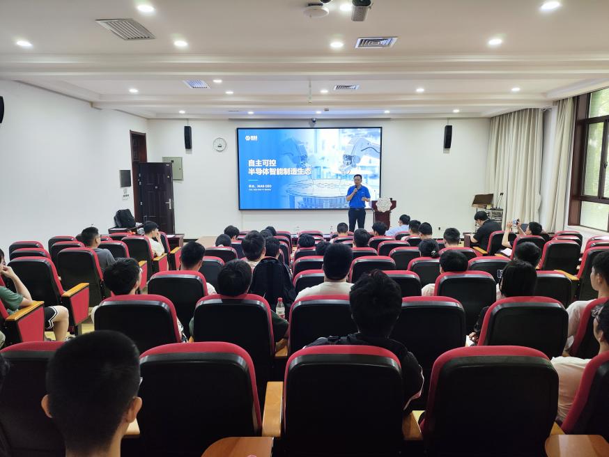 在报告会上,李杰为师生们作了“自主可控半导体智能制造生态”的专题报告,他首先介绍了埃克斯工业依托原创的、国际领先的“ROPN系统工程建模+工业AI决策算法”技术,开发出适用半导体行业的如智能排产与调度、设备预测性维护等产品,并已成功应用于国内头部晶圆厂、封测厂、设备厂等一线大厂,实现了国产替代,填补了国内空白。接着他详细阐述了公司将大数据、人工智能、Chat-GPT等技术融入在传统的半导体生产控制与管理软件中,向企业在工艺优化、良率提升、设备管理、数据分析等过程中提供更加智能、先进、便捷的生产管理体验,以此提升企业的核心竞争力。最后,他讲述了对当下飞速发展的人工智能技术的思考,希望将埃克斯工业打造成细分领域的行业龙头,能破题我国集成电路工业软件和智能制造方面的痛点和难点。