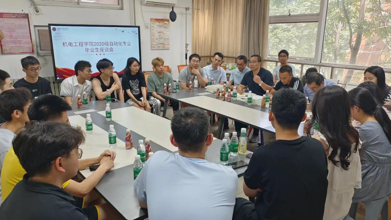 的支持与贡献,他鼓励毕业生们无论未来身处什么岗位,都要勇往直前,积极奋斗,不断书写更加绚丽的人生篇章。同时,也希望各位毕业生能够从自身体验及社会需求出发为自动化专业建设建言献策。随后,各位毕业生代表纷纷发言,他们分享了在四年校园生活中的求学经历和学习感悟,汇报毕业去向,也就课程设置、实践教学、科研支持等方面提出了建设性意见和建议。毕业生代表与参会的11名专业任课教师进行充分、深入的交流。