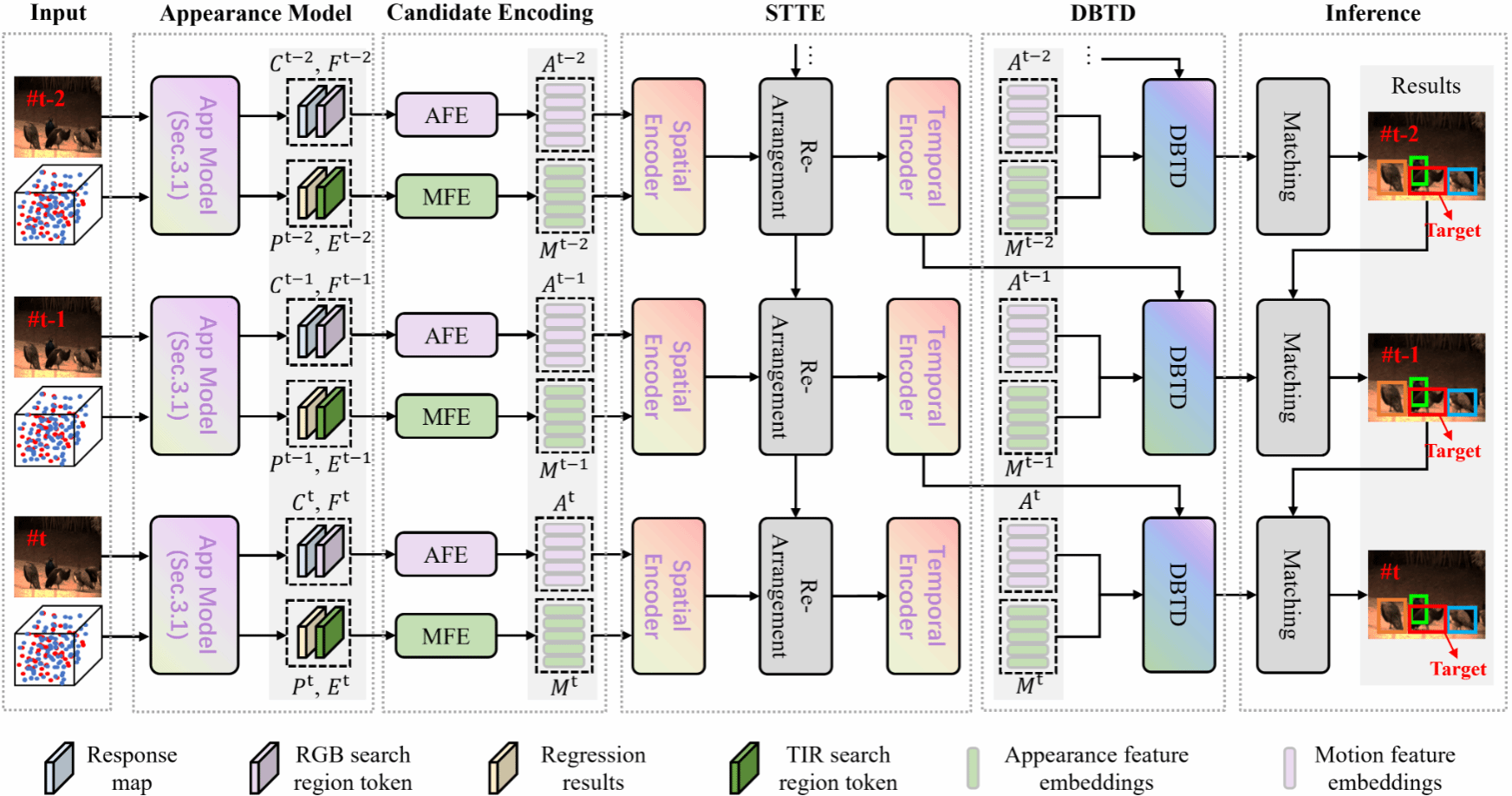 博士研究生张天路的论文《Revisiting motion information for RGB-Event tracking with MOT philosophy》提出一种联合外观运动建模的RGB-Event目标跟踪框架,从而提高跟踪器的鲁棒性。提出了一种时空编码器建模空间-时间关系,并通过外观-运动信息为每个候选学习判别特征。提出一种双分支解码器,联合运动和外观信息用于候选匹配,从而区分目标和干扰项。实验结果证明所提方法能够显著提升跟踪模型的鲁棒性。