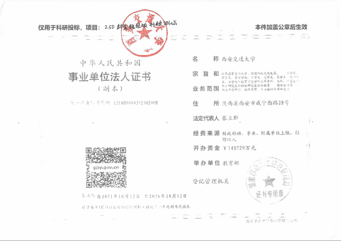 科研协作项目管理办法(试行)》文件规定,为加强学校科研协作项目的管理,确保面向射频器件2.5D封装转接板多场耦合可靠性研究的顺利进行。西安交通大学与项目负责人王永坤将开展科研合作,现将合作相关事项公示如下: