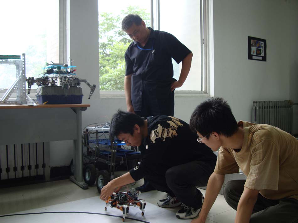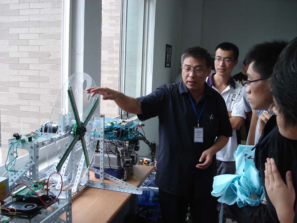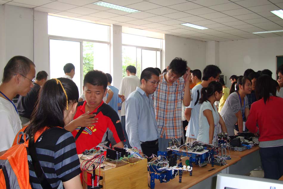 展会现场设在“学校工程训练中心智能化技术及机器人创新实验室”,参展作品有“双足步行机器人”、“四足移动机器人”等曾获“星火杯”特等奖作品和在历届“全国大学生挑战杯”、“全国大学生电子设计竞赛”、“全国大学生嵌入式竞赛”中获得国家级奖项的优秀作品。展会现场测控系主任赵建教授热情地向新生及家长讲解并回答他们的提问。现场“声控装配机械手”、“自动循迹避障智能小车车队”等项目的精彩表演深深地吸引了在场的学生及家长,精巧的作品,高深的制造技术将新生们带入了科学技术的奇妙课堂,极大的激发了新生们学习,制作的兴趣,为我校星火杯举行奠定了新一届人员基础。