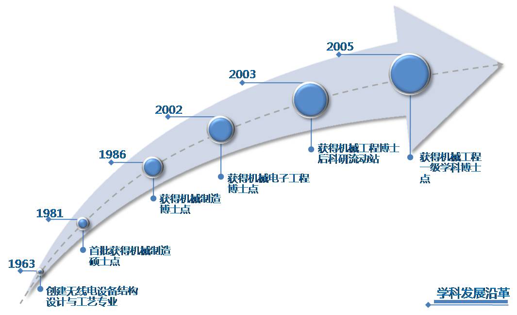 本学科创立于1963年,是我国最早的以机为主机电结合的交叉学科之一,历史悠久,底蕴深厚。1981年首批获得机械制造硕士点,1986年获得机械制造博士点,2002年获得机械电子工程博士点,2003年获得机械工程博士后科研流动站,2005年获得机械工程一级学科博士点。