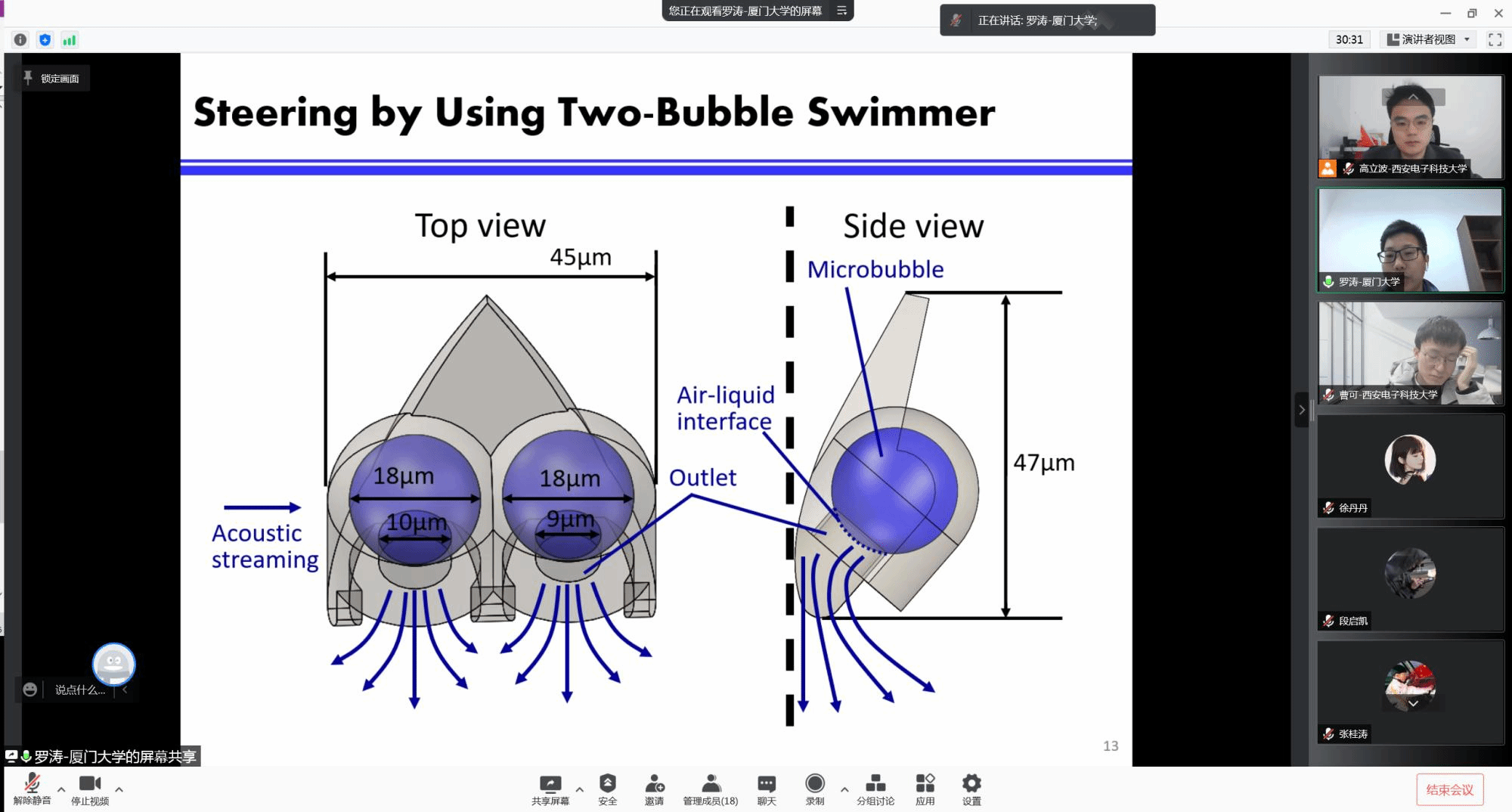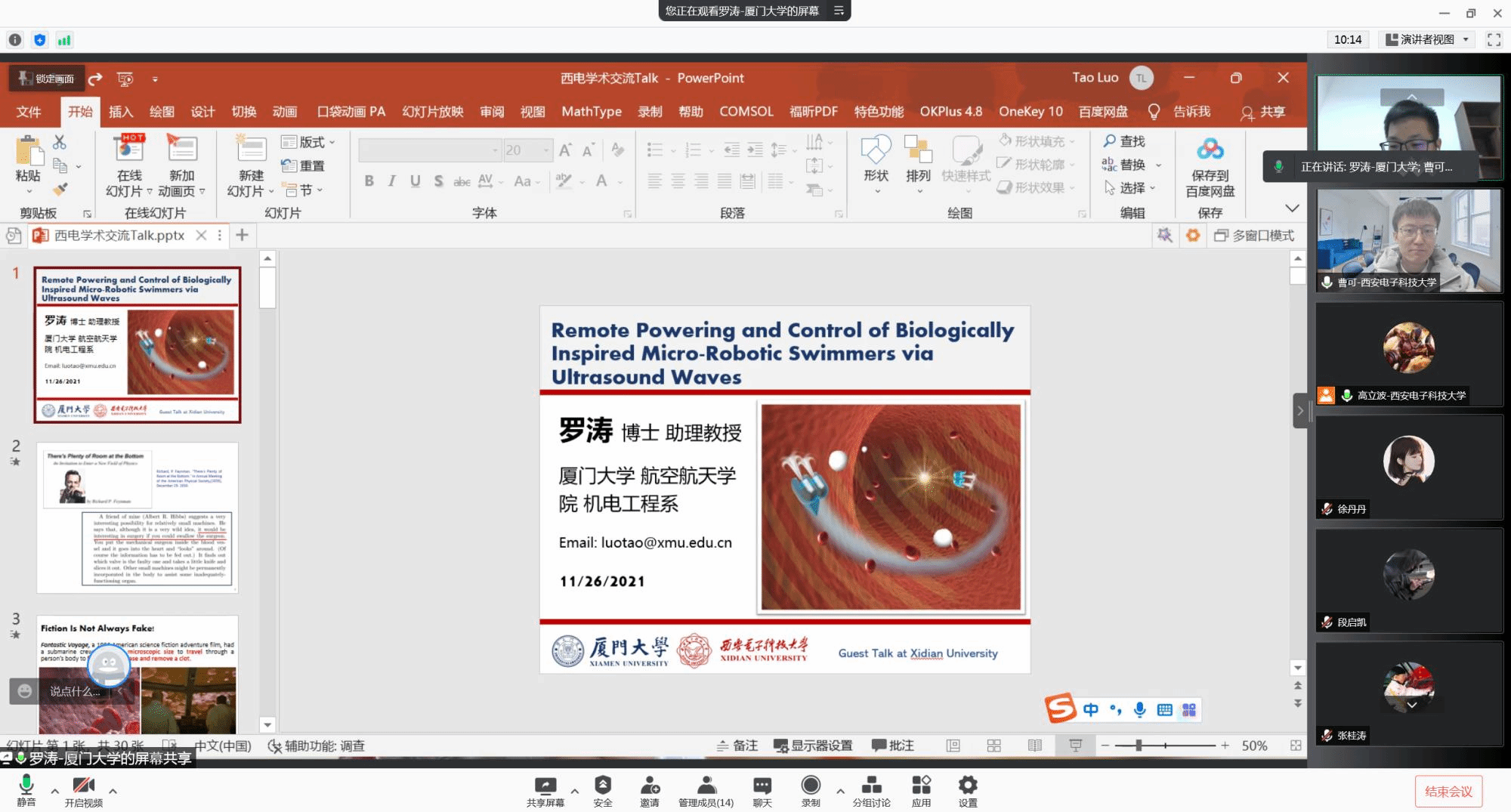 机电工程系助理教授应邀在线上作了题为《Remote Powering and Control of Biologically Inspired Micro-Robotic Swimmers via Ultrasound Waves》的学术报告。本次报告因疫情原因改为线上,高立波,王明智,曹可等测控系师生参加,高立波副教授主持。