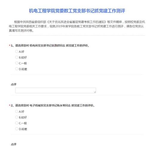 党委分别制作了《机电院学生党支部工作年终考核测评(发支部党员)》、《机电院学生党支部工作年终考核测评(发联系党委委员)》、《机电院学生党支部工作年终考核测评(发党务干事)》三份线上考核问卷,结合各学生党支部工作实际,从支部日常工作开展情况、战斗堡垒作用发挥情况等各方面,向支部党员、联系党委委员以及做爱自拍